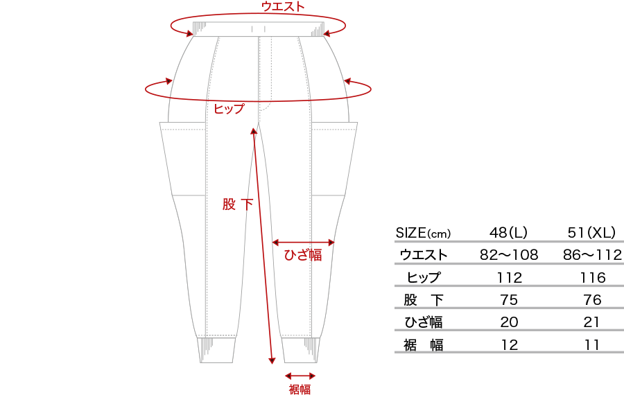 51(XL)ウエスト86-112cm ヒップ116cm 股下76cm 膝幅21cm 裾幅13cm